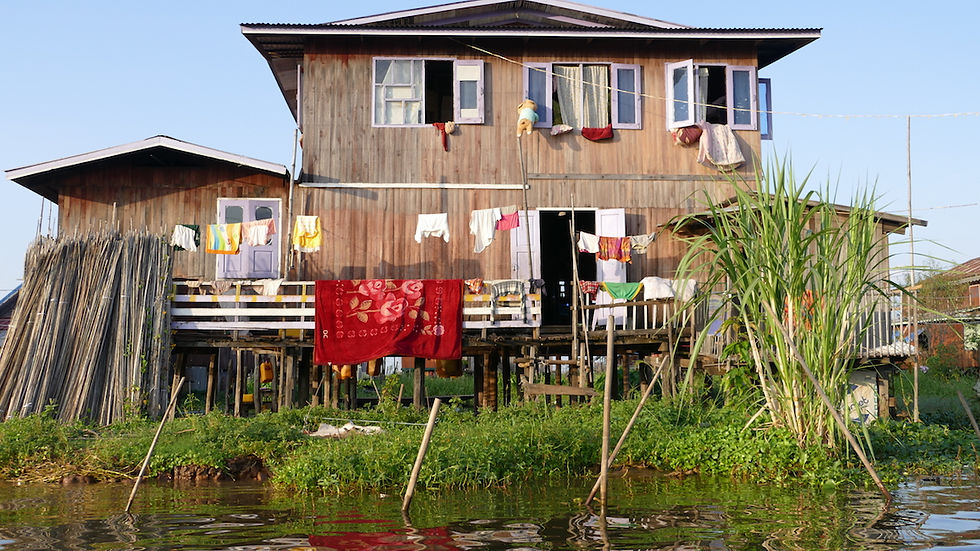 Maisons en bois de toutes les couleurs sur pilotis, flattées par la lumière de fin d'après-midi. Quelques unes ont leur petit lopin de terre herbeuse et parfois fleuri. La plupart se contentent de jardins flottants de jacinthes d'eau.