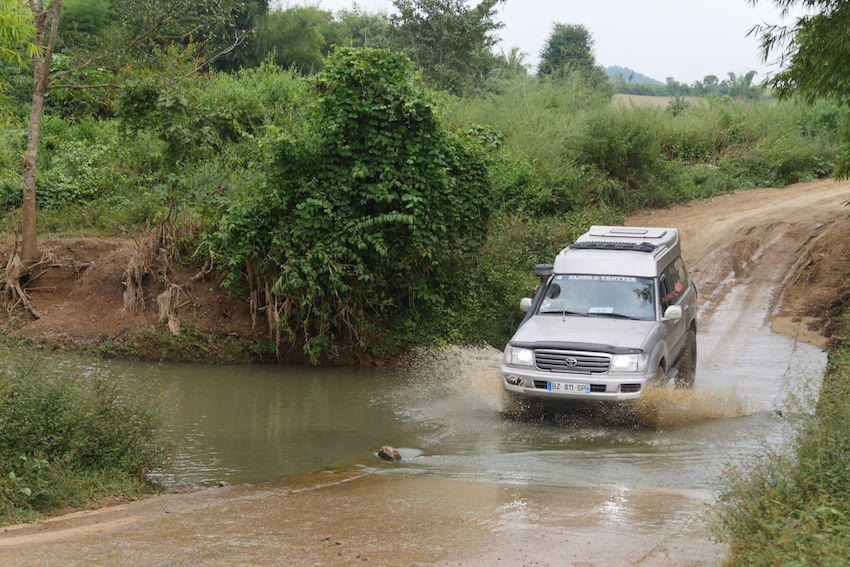 Jolie piste l'après-midi pour rejoindre la rive du Mékong où le bivouac nous attend. La légende urbaine faisant de cette piste un cauchemar boueux, beaucoup y renoncent. En fait, à part un gué ou deux, elle est sèche et praticable, juste très chaotique par moments. Pas le genre de piste à prendre à la saison des pluies, c'est sûr. Mais aujourd'hui, tout va bien.