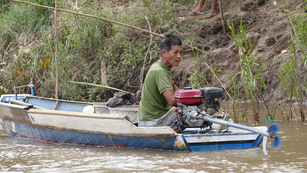 La remontée du fleuve se poursuit, interminable, à contre-courant jusqu'à un premier village, commercial comme il se doit, où l'on fabrique le lao lao, l'alcool de riz laotien. Et où l'on vend écharpes, artisanat et antiquité new-but-look-old. Et aussi des serpents et des scorpions en bocaux...