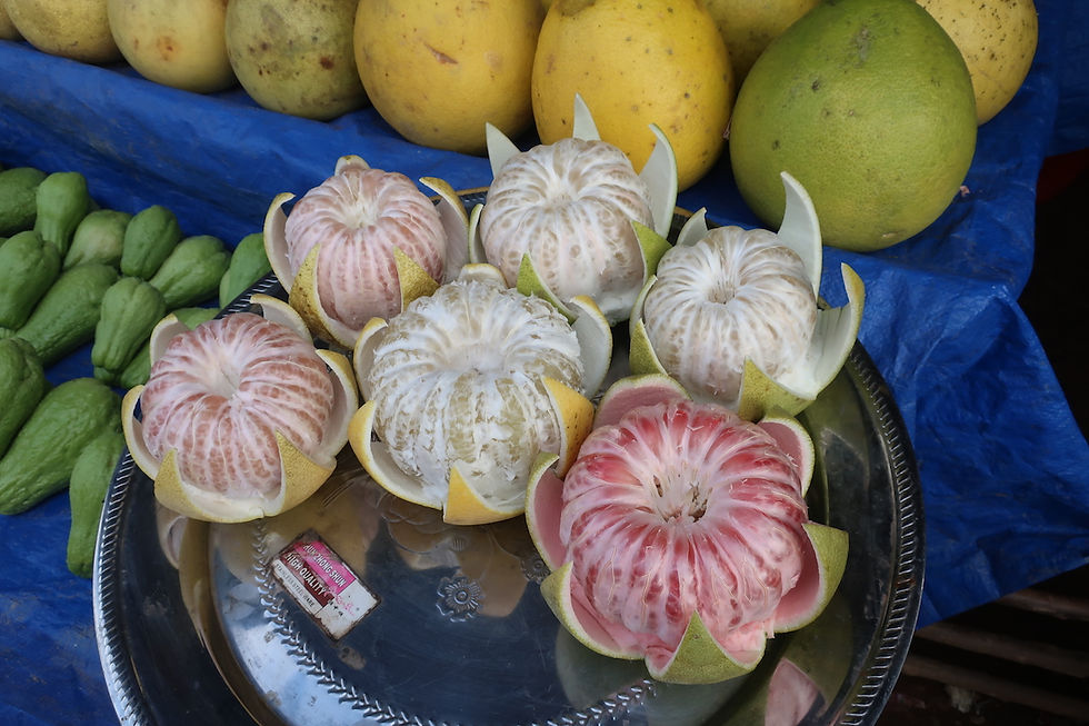 Des étals de fruits et de poivre makhan, ce poivre laotien à l'odeur étonnante dont chaque grain est logé dans une petite cosse.