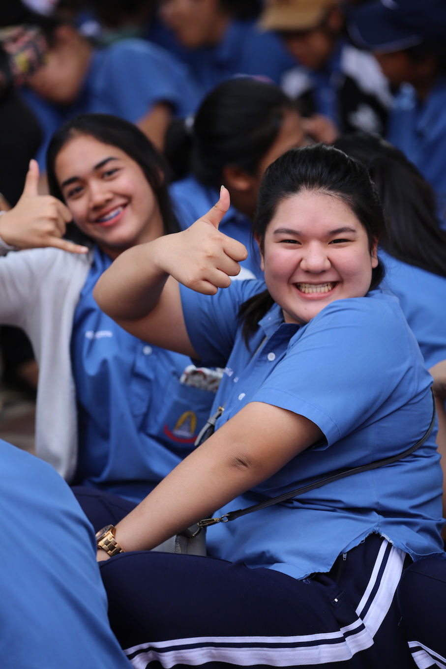 En route maintenant pour Wat Pho, le temple du Bouddha couché, dans l'enceinte duquel se trouve aussi la plus grande école de massage de Thaïlande... En même temps qu'un bon millier de lycéens et lycéennes en déplacement scolaire... Nous passons devant les portraits du roi mort et de son fils (qui n'a pas un physique facile...)