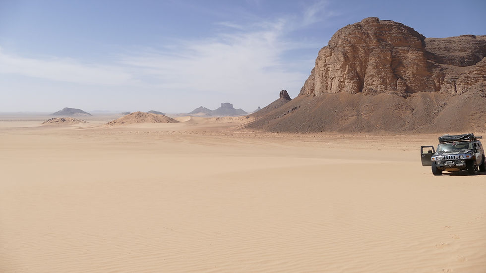 Justement, il est temps de faire notre première halte pour admirer des peintures rupestres... mais pas la dernière! A croire que le Sahara était peuplé de peintres et de dessinateurs il y a 10000 ans. En tous cas, il y avait du monde et beaucoup plus d'animaux qu'aujourd'hui! Encore un peu de patience pour voir les peintures et les pétrographes rupestres... C'est comme le désert, ça se mérite et je vous assure que vous finirez, vous aussi, par vous en lasser!!!