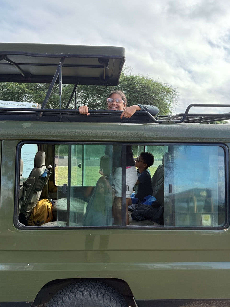 Notre véhicule s'est mis en mode safari. C'est à dire toit relevé pour que chacun puisse voir de tous les côtés, debout pour les grands, montés sur les sièges pour les petits.