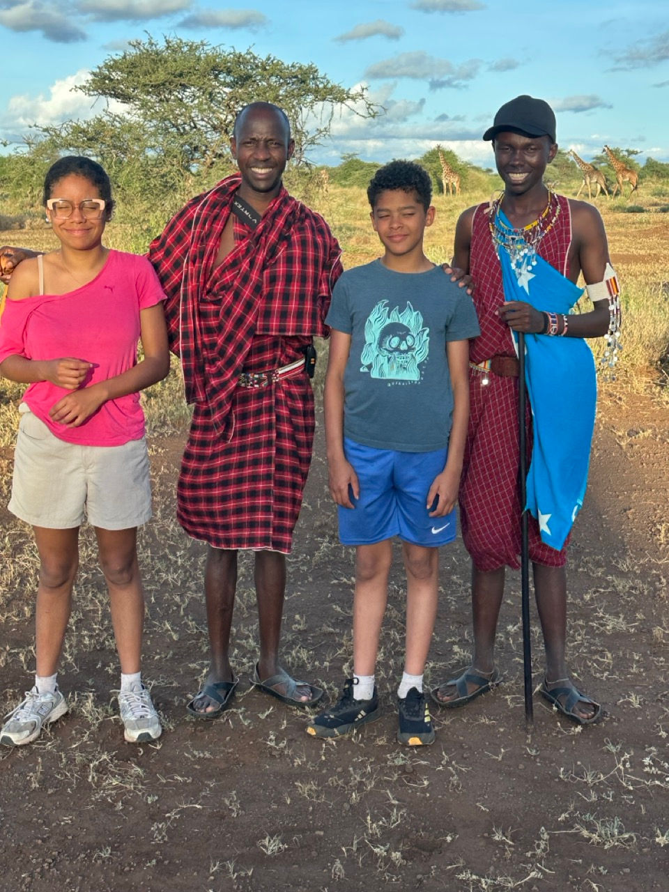 Jackson est parti en éclaireur pour trouver des animaux. Il nous préviendra par talkie-walkie. Saïtabana reste avec nous derrière. Nous le connaissions depuis hier sous le nom d'Eric et habillé à l'occidentale. Aujourd'hui, il est redevenu Masaï pour l'occasion. En vacances chez lui actuellement, il étudie l'ornithologie à Nairobi et veut travailler comme guide plus tard. Il parle déjà français, espagnol et un peu d'italien. Jakson a trouvé des girafes et nous le rejoignons. J'en compte 6, peut-être 7. Mais elles s'enfuient aussitôt. Les retardataires de la troupe n'ont même pas eu le temps de les voir. Acuna matata! No pasa nada!